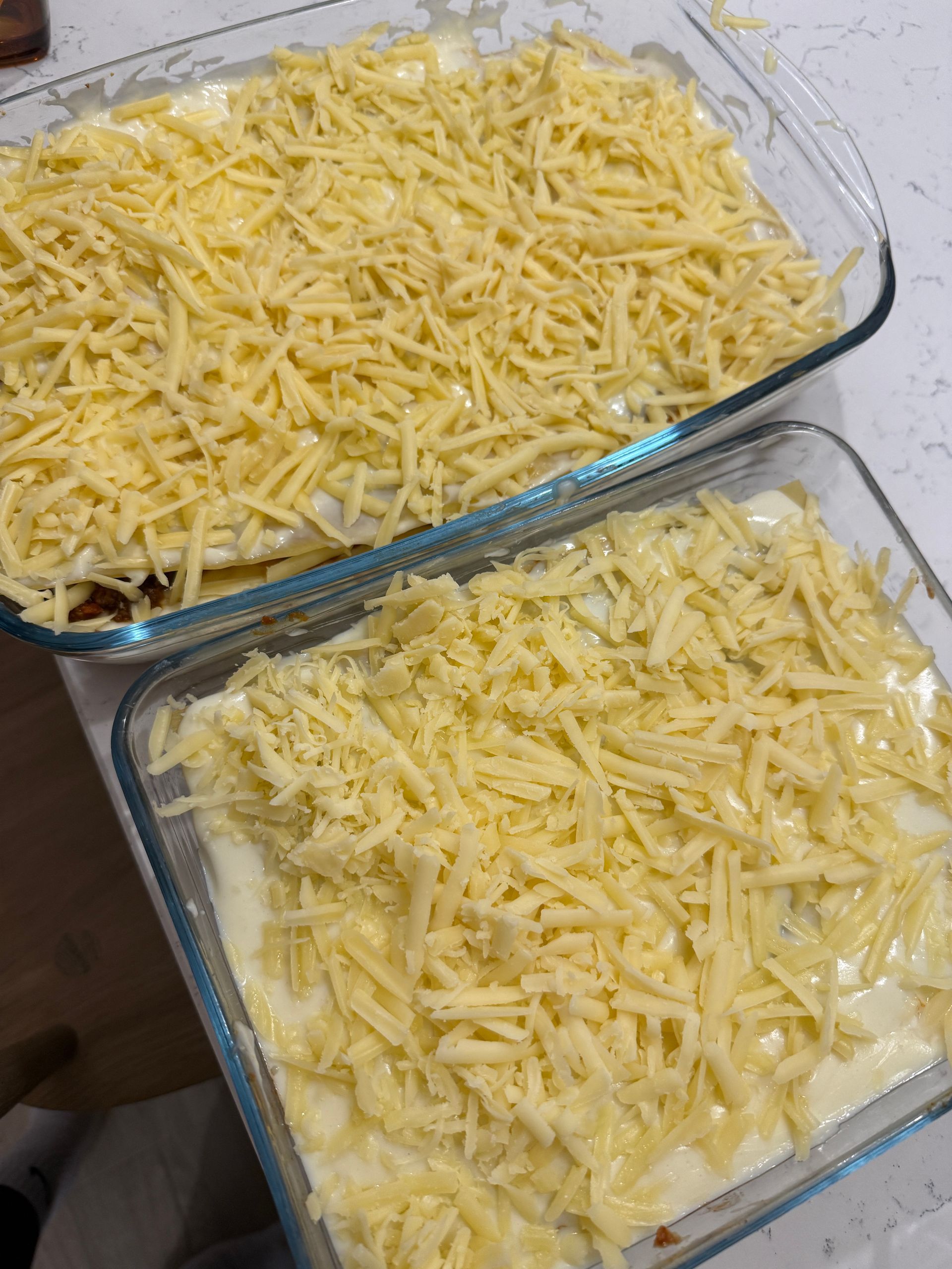 - Once both components are ready. You can assemble the lasagne into 2 large baking dishes. Start with 1/6 of meat mixture at the bottom of each dish, top with a few slices of mozzarella and then the lasagne sheets and the white pasta sauce. Repeat twice so each dish has 3 layers. Top the final layer with the grated cheddar.